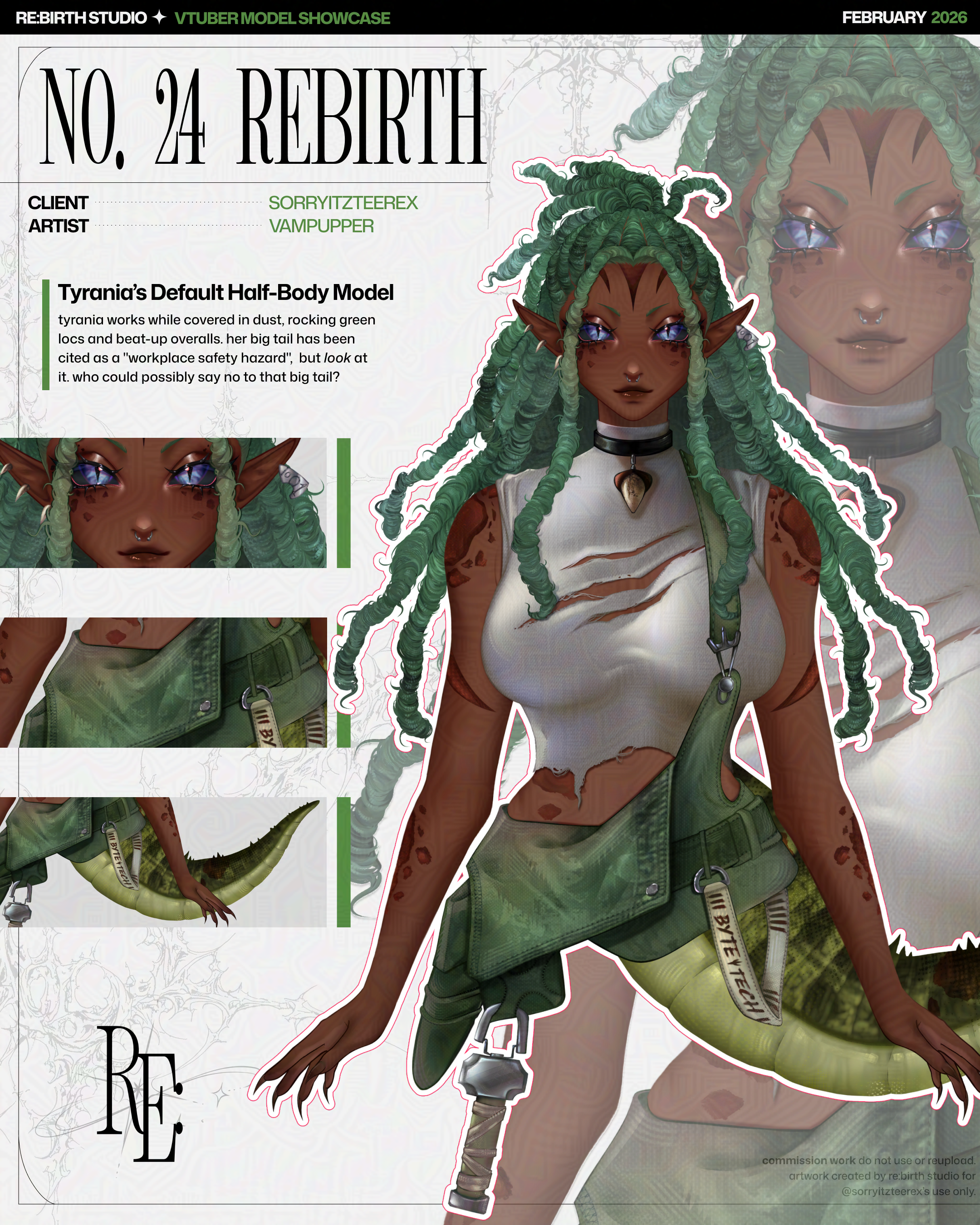 HALF BODY VTUBER MODEL ART + RIG FOR: TYRANIA Feb 26 Written By Re:birth Studio MODEL SHEET. RIG SHOWCASE. “Half body vtuber model for @sorryitzteerex (X)٩(ˊᗜˋ*)و ♡ !!” — Model art completed 24/2/2026 Re:birth Studio